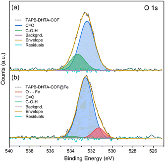 对TAPB-DHTA-COF吸附Fe2+后的O 1s核心能级进行分析,发现吸附后羟基信号减弱,新出现与O-Fe相互作用的信号。