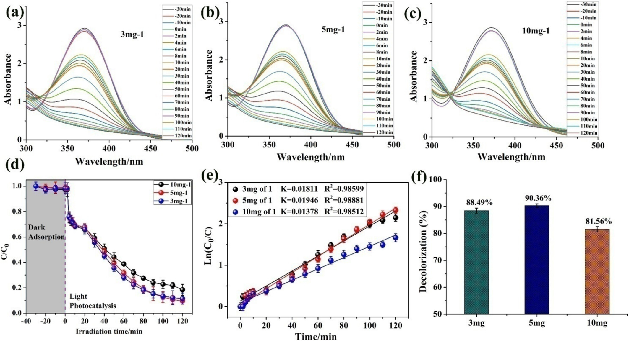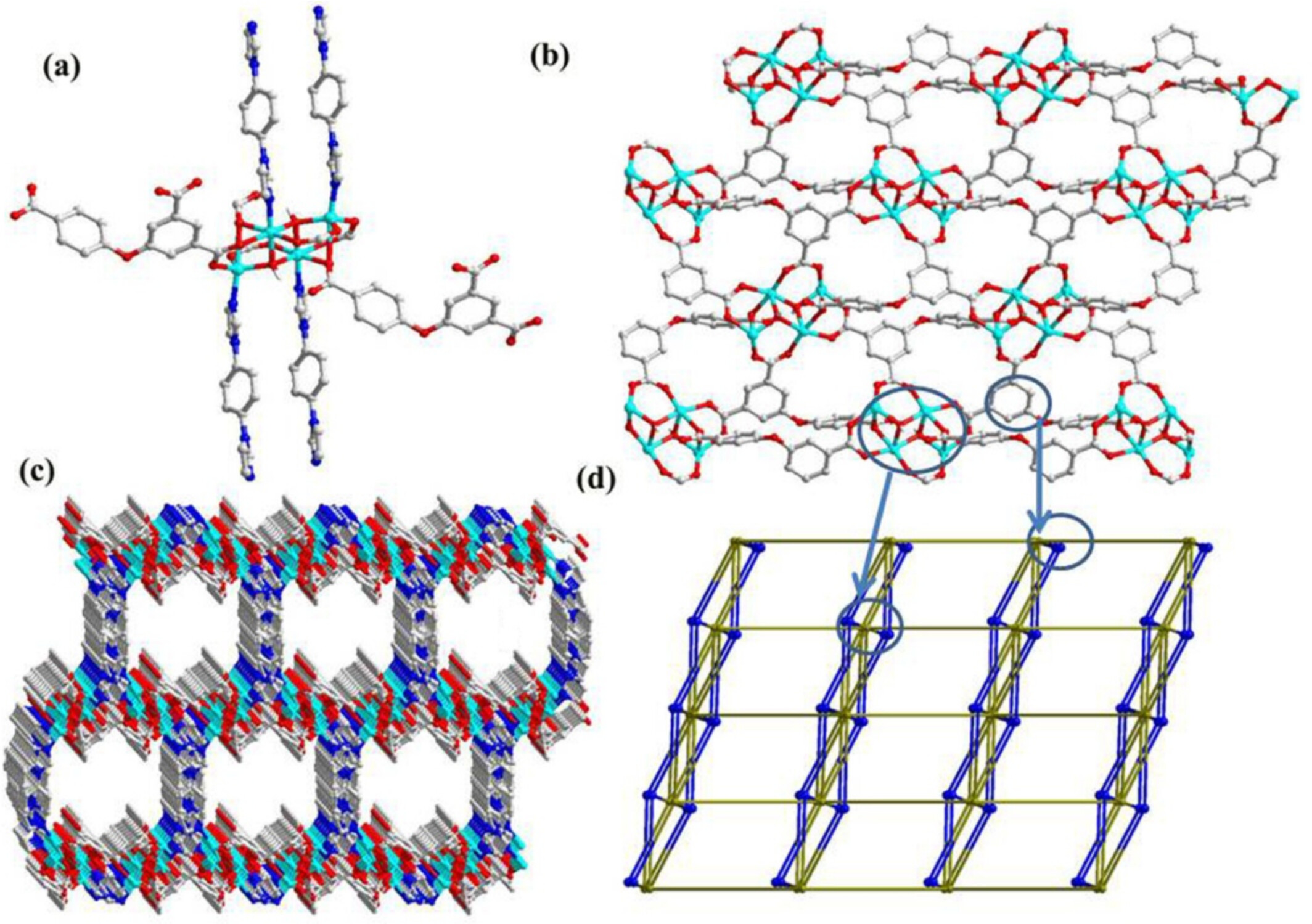 四川轻化工大学路璐、深圳职业技术大学汪小雄和University of Lucknow的Abhinav Kumar老师等报道的本篇文章(Appl Organomet Chem. 2024, e7609.)中通过溶剂热法合成了一种新型的钴(II)基金属有机框架(MOF)材料[Co2(μ2-OH)(L)(bib)·H2O·2DMA]n (1)(其中H3L = 5-[4-羧基苯氧基]异酞酸,bib = 1,4-双[1-咪唑基]苯,DMA = 二甲基乙酰胺)。该MOF展示了前所未有的拓扑结构,具有(43)2(4.66.1686)的Schläfli符号,并表现出3.68 eV的光学带隙,因此被用作光催化剂来光降解诸如甲硝唑、替硝唑、硝呋太和二甲硝唑等抗生素。在这些抗生素中,它对硝呋太的光催化降解表现出特别的高效性。通过实验和计算技术,如自由基捕获实验、态密度和Hirshfeld表面分析,探讨了光驱动硝呋太分解的机理路径。