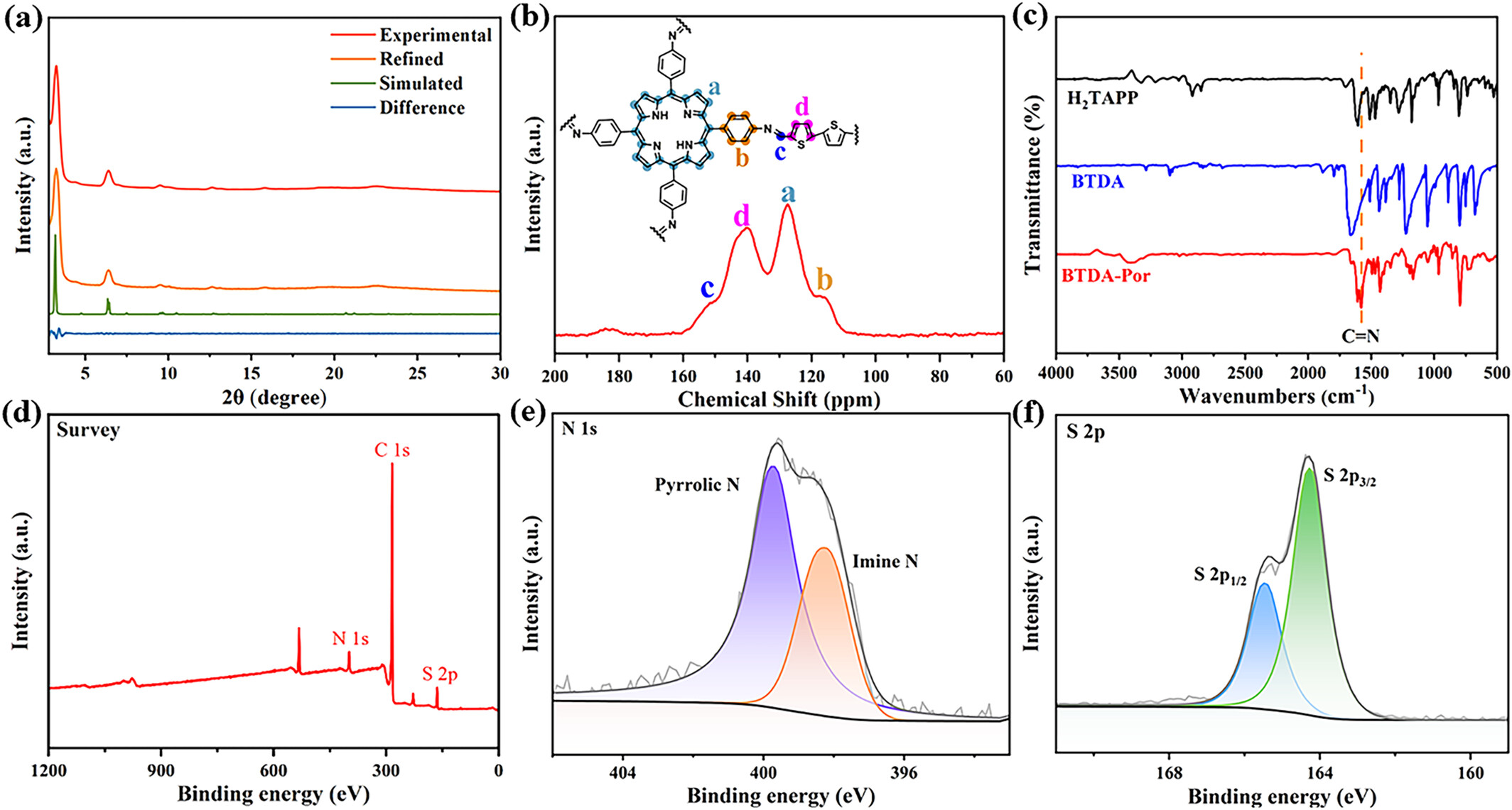 - 实验结果:通过粉末X射线衍射(PXRD)和固体核磁共振(ss NMR)光谱确认了BTDA-Por的结晶性和化学结构。