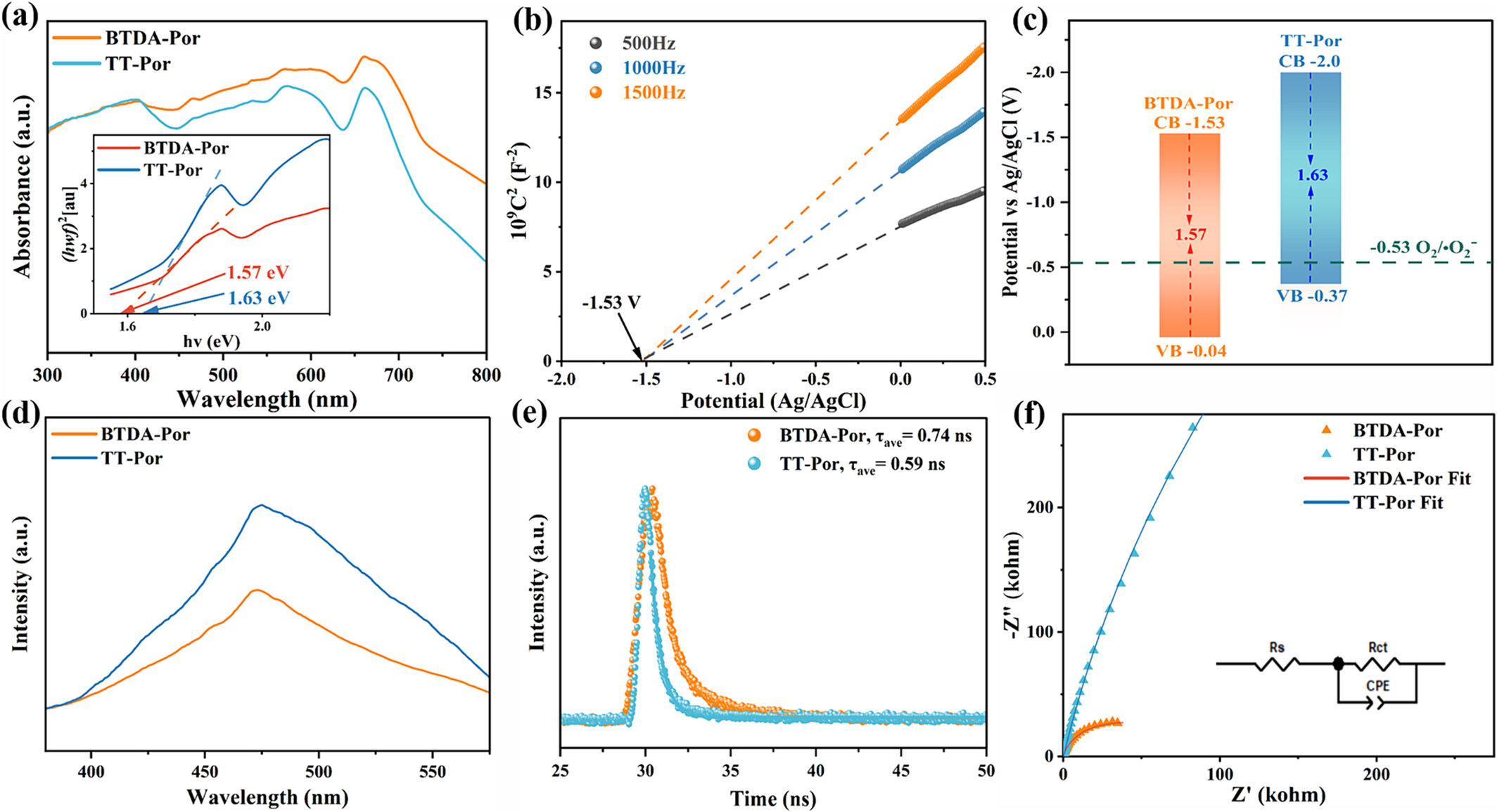 - 测试结果:BTDA-Por和TT-Por在可见光区域有广泛的吸收,BTDA-Por的吸收范围由于D-A相互作用而红移。