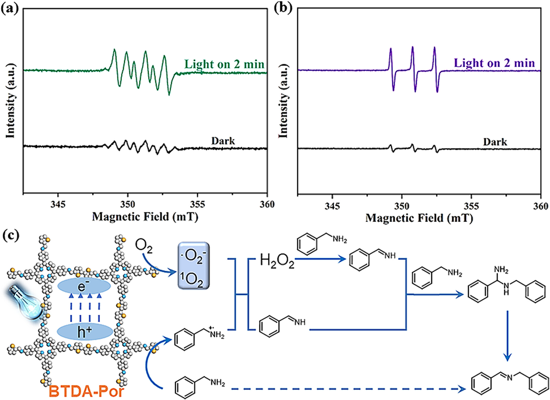 - 实验结果:在蓝光照射下,BTDA-Por催化的苯甲胺氧化偶联反应在40分钟内实现了99%的转化率,而TT-Por仅实现了48%的转化率。
