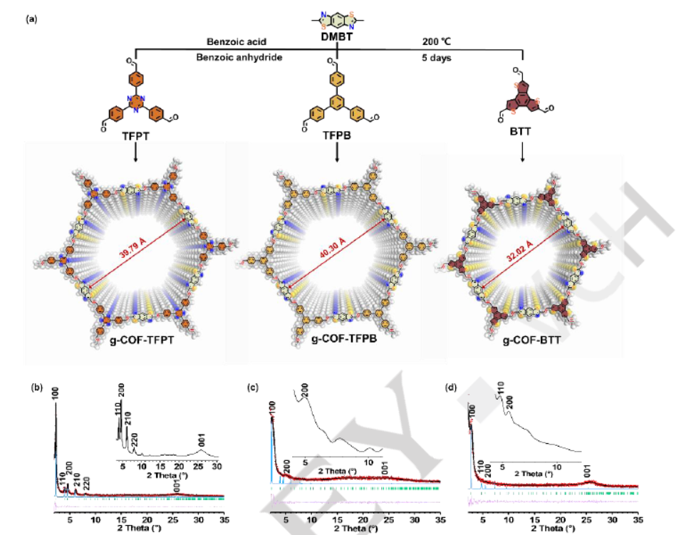 2. 选择1,3,5-三(甲醛苯基)苯 (TFPB)、2,4,6-三(4-甲醛苯基)-1,3,5-三嗪 (TFPT)和苯并[1,2b:3,4-b':5,6-b'']三硫杂苯-2,5,8-三甲醛 (BTT)作为三醛基单体,与DMBT反应,通过溶剂热法合成目标COFs,分别命名为g-COF-TFPB、g-COF-TFPT和g-COF-BTT。