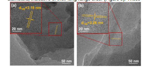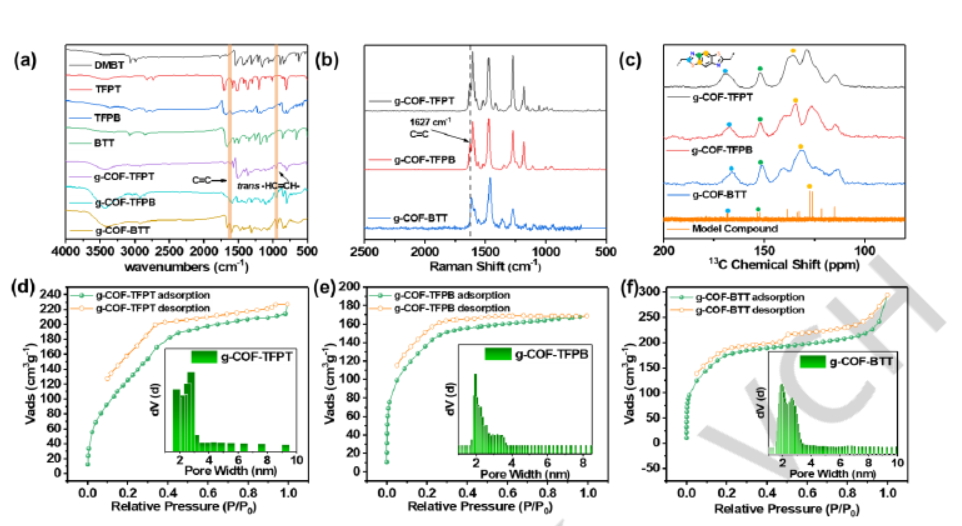 - 测试结果:BET比表面积分别为508.79 m² g⁻¹ (g-COF-TFPT)、504.23 m² g⁻¹ (g-COF-TFPB)和653.01 m² g⁻¹ (g-COF-BTT)。孔隙体积分别为0.39 cm³ g⁻¹ (g-COF-TFPT)、0.33 cm³ g⁻¹ (g-COF-TFPB)和0.54 cm³ g⁻¹ (g-COF-BTT)。