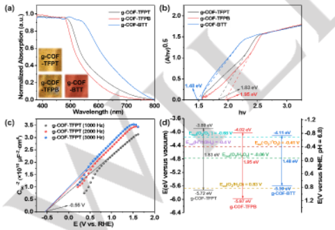 - 测试结果:g-COF-TFPT和g-COF-TFPB的吸收带边分别位于520 nm和540 nm,g-COF-BTT的吸收带边明显红移至620 nm。带隙分别为1.83 eV (g-COF-TFPT)、1.95 eV (g-COF-TFPB)和1.48 eV (g-COF-BTT)。