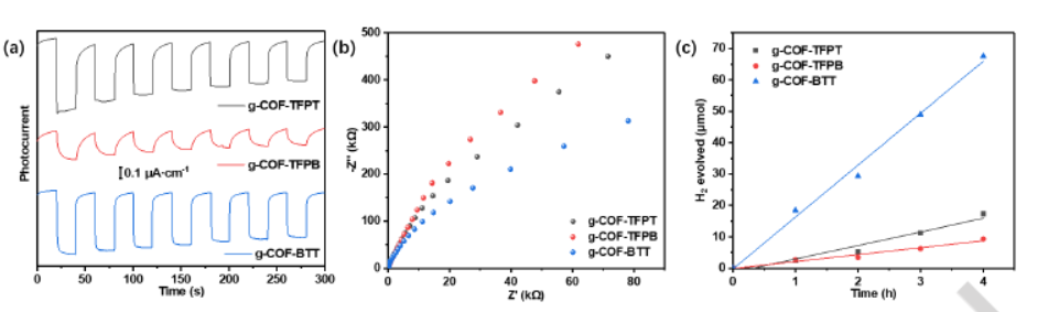 - 测试结果:在0 V vs RHE偏压下,g-COF-BTT的阴极光电流为0.44 μA cm⁻²,高于g-COF-TFPT (0.40 μA cm⁻²)和g-COF-TFPB (0.16 μA cm⁻²)。