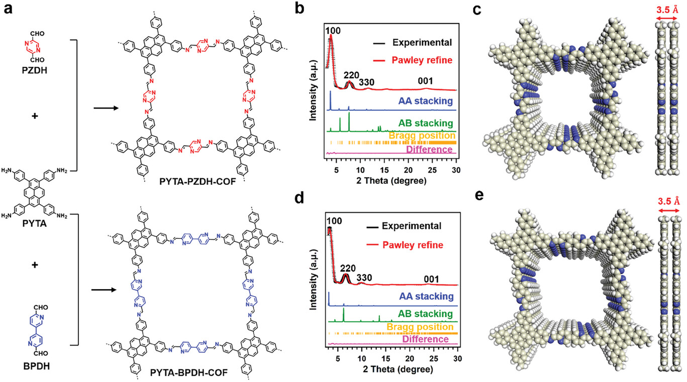 3. 在120°C下反应72小时,通过溶剂热法合成PYTA-PZDH-COF和PYTA-BPDH-COF。
