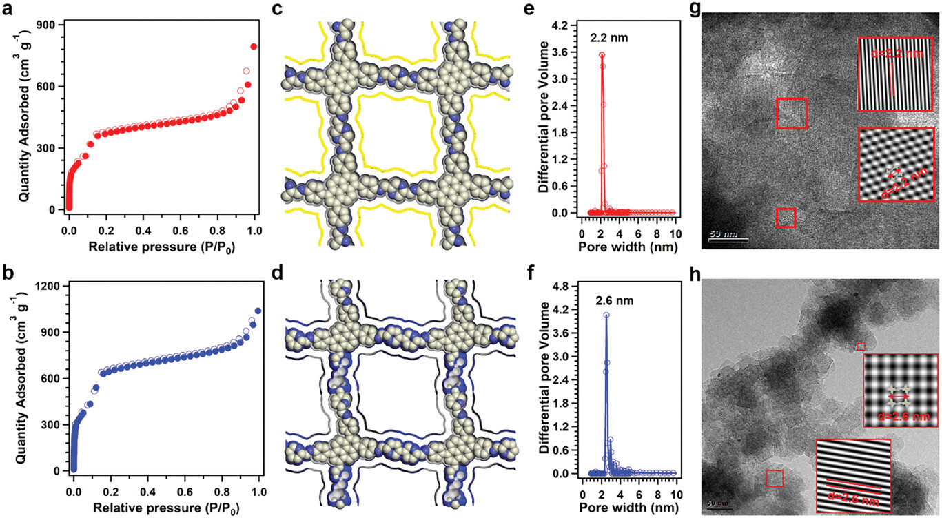 - 测试结果:通过氮气吸附-脱附等温线测量,PYTA-PZDH-COF和PYTA-BPDH-COF的BET比表面积分别为1692 m²/g和2076 m²/g。孔径分别为2.2 nm和2.6 nm,孔体积分别为1.0 cm³/g和1.3 cm³/g。