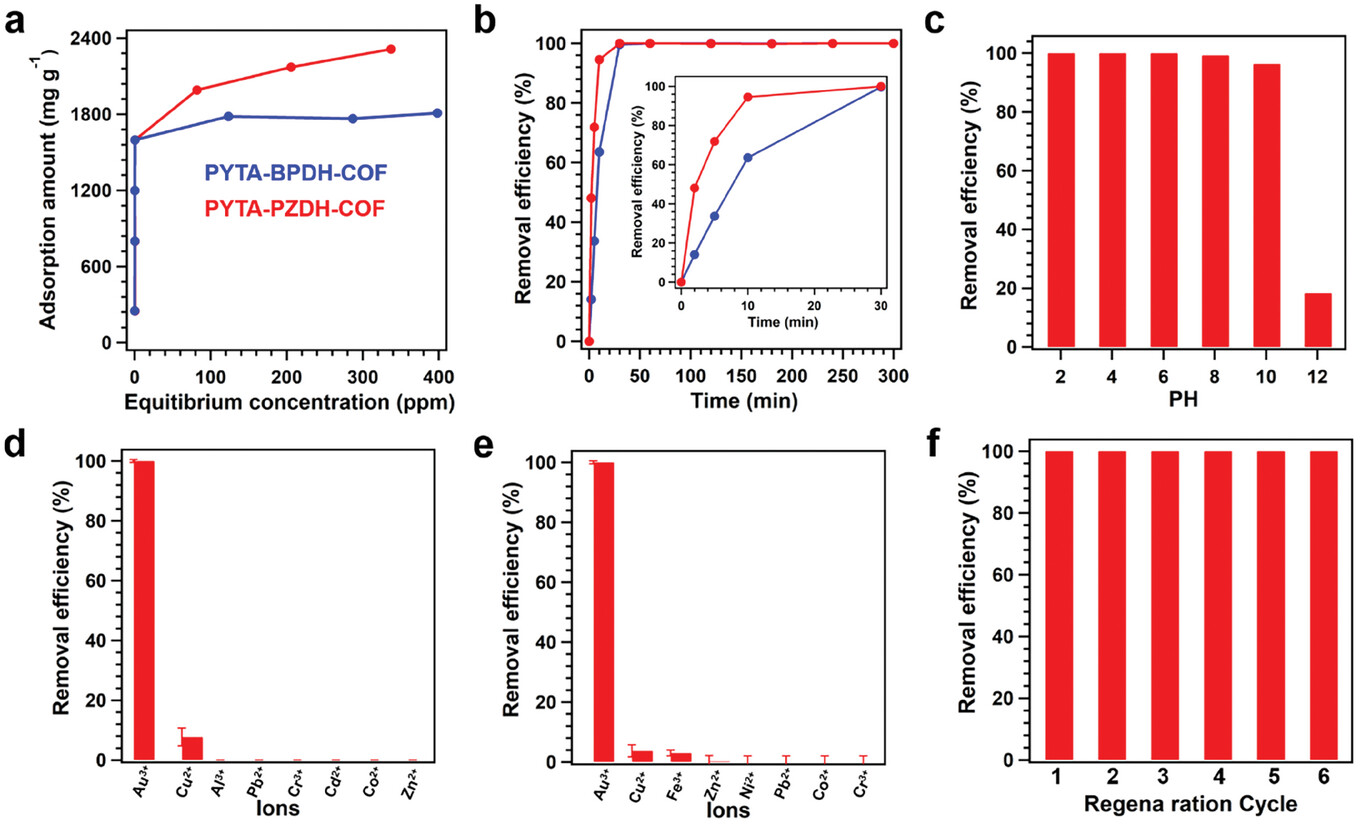 - 实验结果:PYTA-PZDH-COF和PYTA-BPDH-COF的最大金捕获容量分别为2314 mg/g和1810 mg/g。PYTA-PZDH-COF在10分钟内达到最大吸附容量的95%。