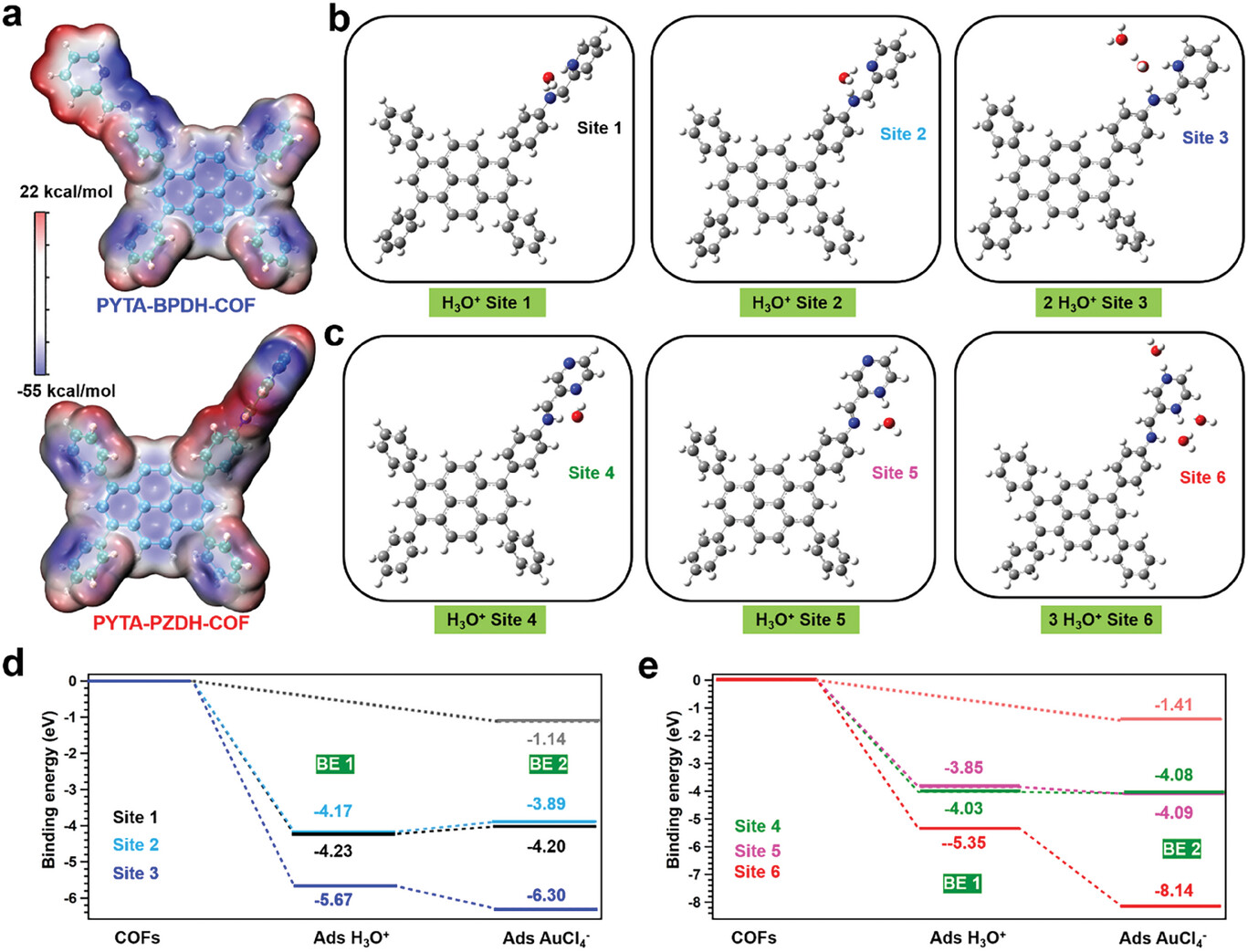 随着电子产品的普及,全球对贵金属的需求不断增加,传统的从矿石中开采金离子的方法已无法满足日益增长的需求。因此,从电子废物中提取金变得尤为重要。尽管已有多种吸附剂如沸石、纳米粒子和碳材料被广泛研究用于金回收,但这些材料的吸附容量和可回收性较低。中国科学院大学丁雪松、徐庆、曾高峰老师等报道的本篇文章(Small 2024, 2404192)中通过构建具有协同连接臂和连接点的共价有机框架(COFs),实现了高效金捕获。设计的COFs(PYTA-PZDH-COF和PYTA-BPDH-COF)以吡嗪或联吡啶为连接臂,展示了高比表面积(分别为1692和2076 m²/g),为金捕获提供了高比表面积。此外,连接臂和连接点中的路易斯碱性氮原子易于质子化,这使得它们能够通过库仑力快速捕获金。PYTA-PZDH-COF和PYTA-BPDH-COF的最大金捕获容量分别为2314和1810 mg/g,高于其他报道的COFs。更重要的是,PYTA-PZDH-COF能够快速吸附动力学,在10分钟内达到最大结合容量的95%。理论计算揭示了这两种COFs中的氮原子同时质子化,使得质子化的PYTA-PZDH-COF更容易结合AuCl4⁻,进一步加速了结合过程。本研究为通过预先设计和表面修饰定制COF提供了新见解。