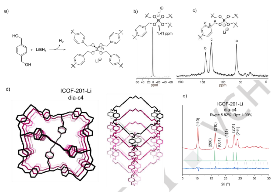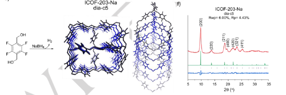 - 实验结果:ICOF-201-Li的晶体结构为四重穿插的dia拓扑结构,具有高度结晶性。SEM图像显示ICOF-201-Li为棒状聚集体。