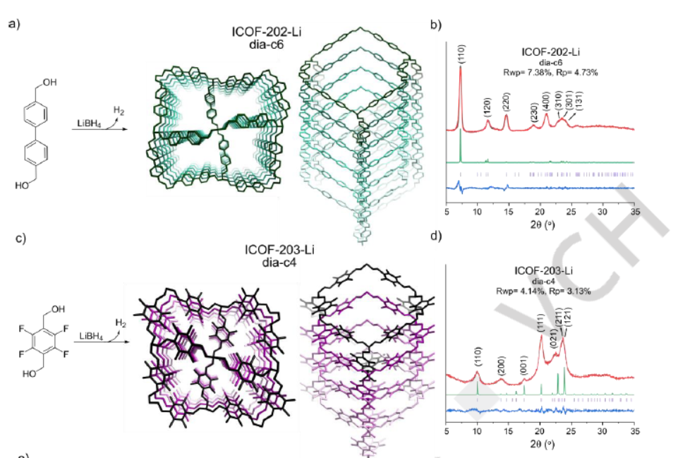 2. 选择4,4'-双(羟甲基)联苯和2,3,5,6-四氟-1,4-苯二甲醇作为单体,使用锂硼氢化物(LiBH4)和钠硼氢化物(NaBH4)分别合成ICOF-202-Li和ICOF-203-Li,以及ICOF-203-Na。