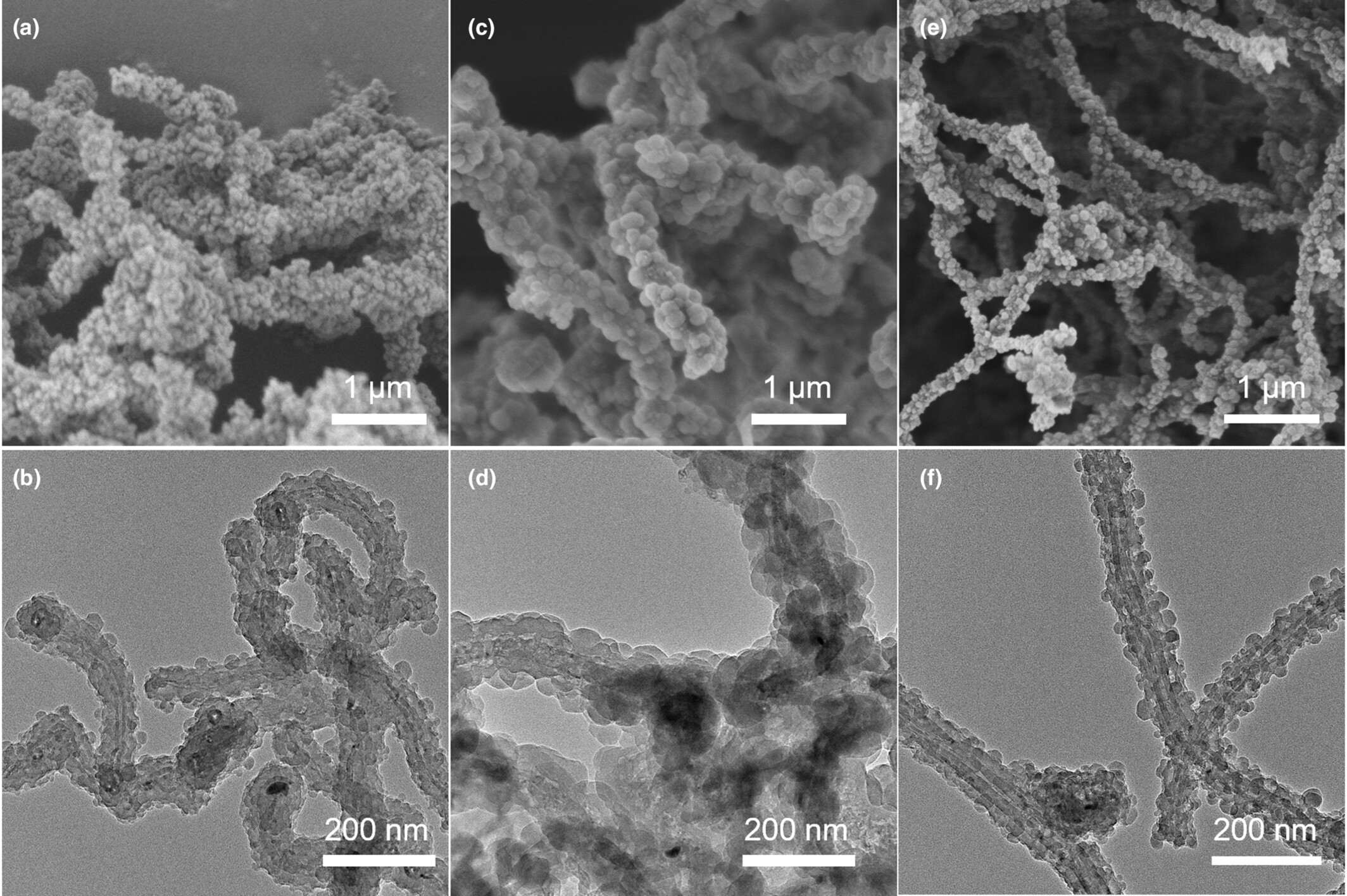- 实验结果:通过SEM和TEM观察到CNT@COF-X复合材料表面粗糙,由纳米颗粒组成,CNTs被COFs纳米颗粒均匀覆盖,形成了核壳异质结构。