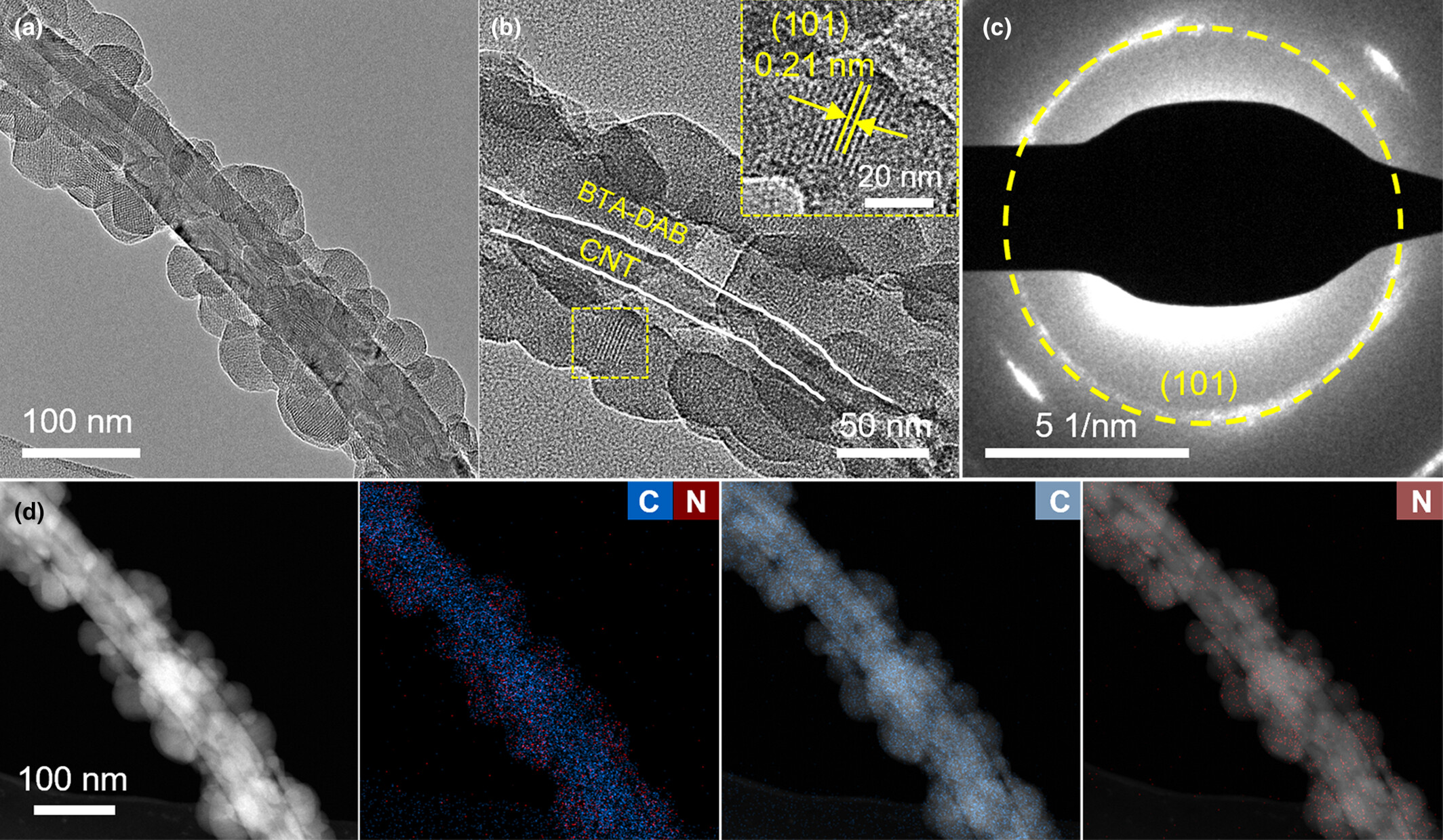 - 测试结果:BTA-DAB-COF的XRD图谱显示在3.45°、6.12°和7.05°处有显著衍射峰,对应于(100)、(110)和(200)晶面。CNT@COF-X复合材料的XRD图谱与BTA-DAB-COF相似,表明成功合成了核壳结构。