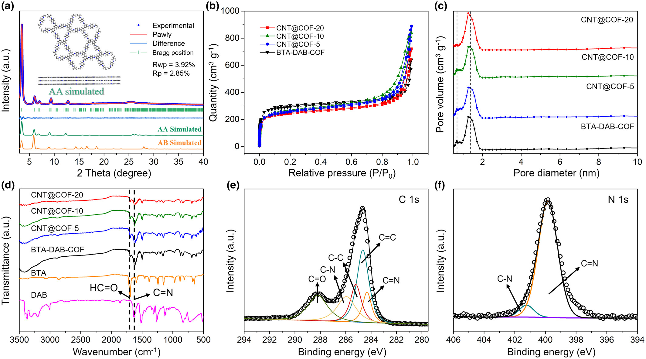 - 测试结果:CNT@COF-20的C 1s和N 1s XPS光谱显示了C=N、C=C、C–C、C–N和C=O基团的存在,进一步证实了材料的结构。