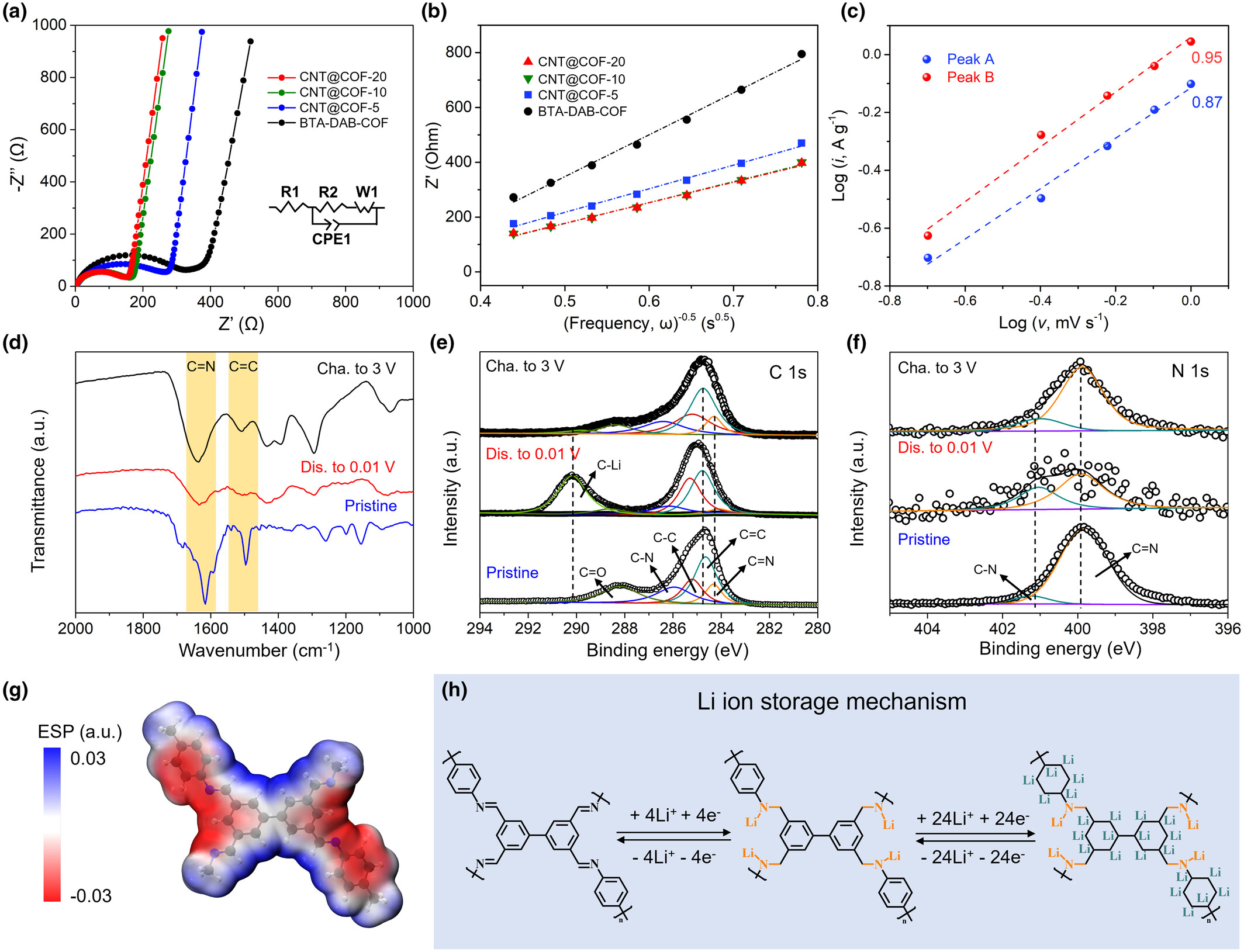 - 利用CNTs作为导电核,COFs作为氧化还原活性壳,形成了具有高比表面积的三维杂化结构,促进了电子传输和锂离子的电化学利用。