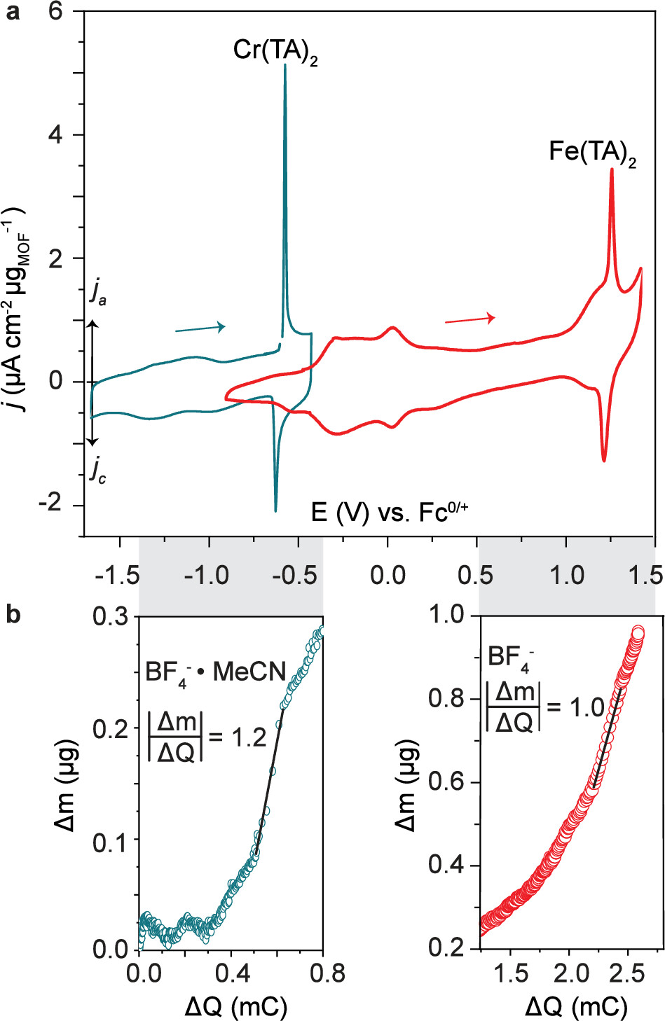 - Cr(TA)2纳米晶体在BF4−存在时表现出约-0.6V vs Fc0/+的氧化还原峰。