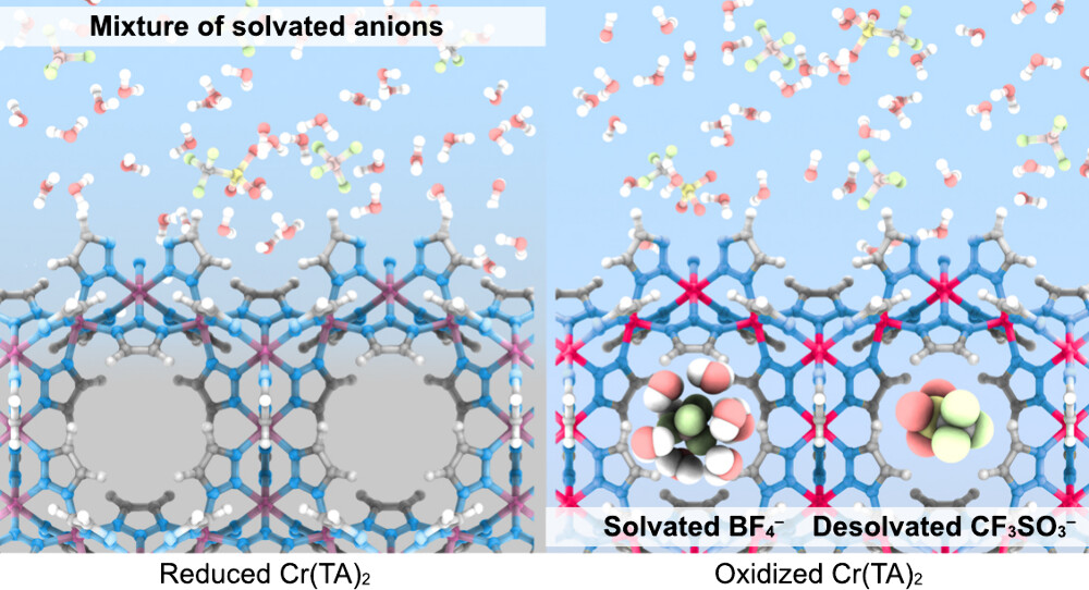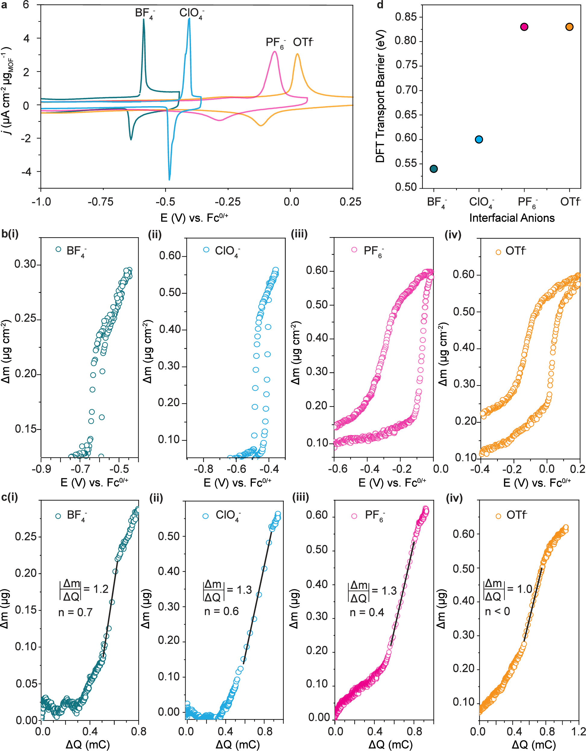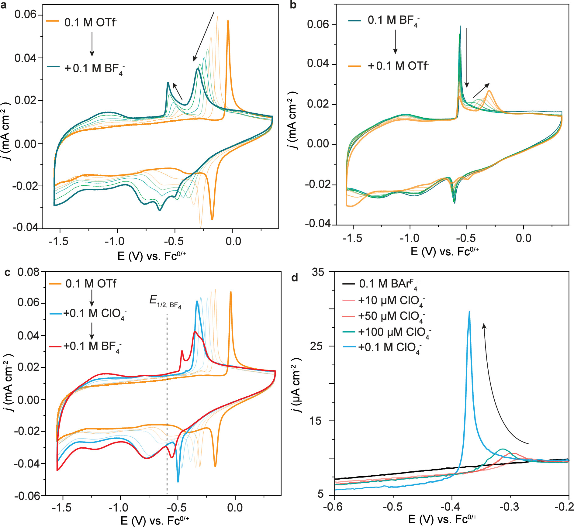1. 在含有Cr(TA)2纳米粒子薄膜的电解液中逐步添加不同阴离子(如TBABF4、TBAOTf和TBAClO4)。