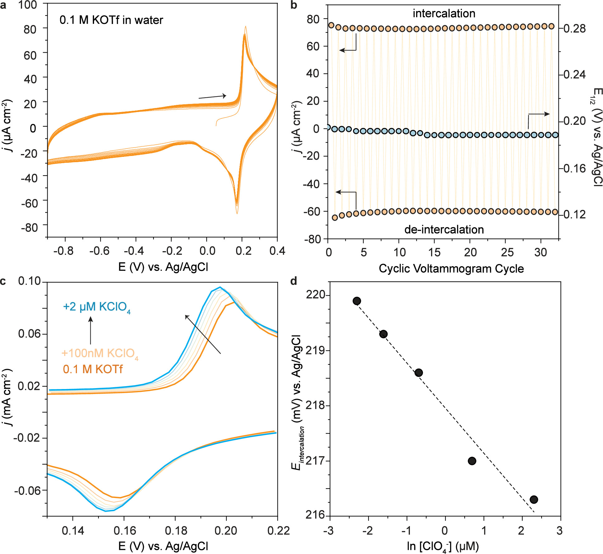 - 在ClO4−存在时,Cr(TA)2纳米晶体的氧化还原峰表现出显著的阴极偏移,检测限低至50 nM。