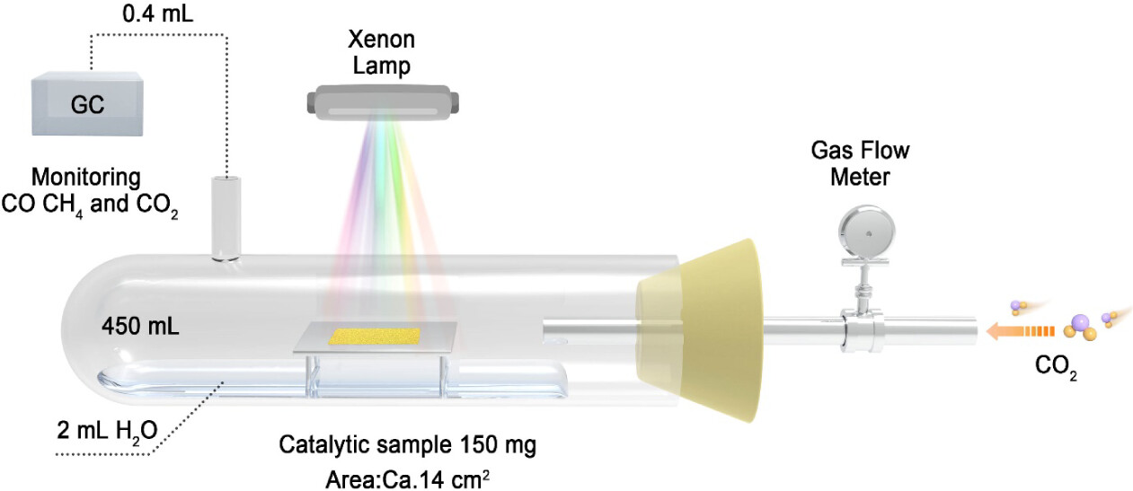- 注入2 mL水,使用300 W氙灯通过420 nm滤波片照射可见光,光照强度为100 mW/cm2。