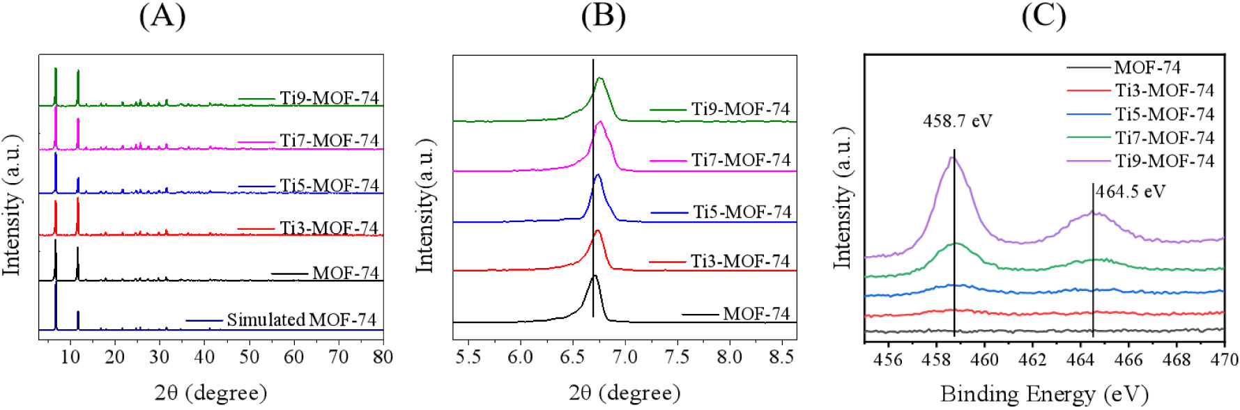 - 结果:合成的MOF74样品的XRD图案与模拟的MOF74几乎相同,表明Ti4+离子的掺入没有改变MOF-74的晶体结构。