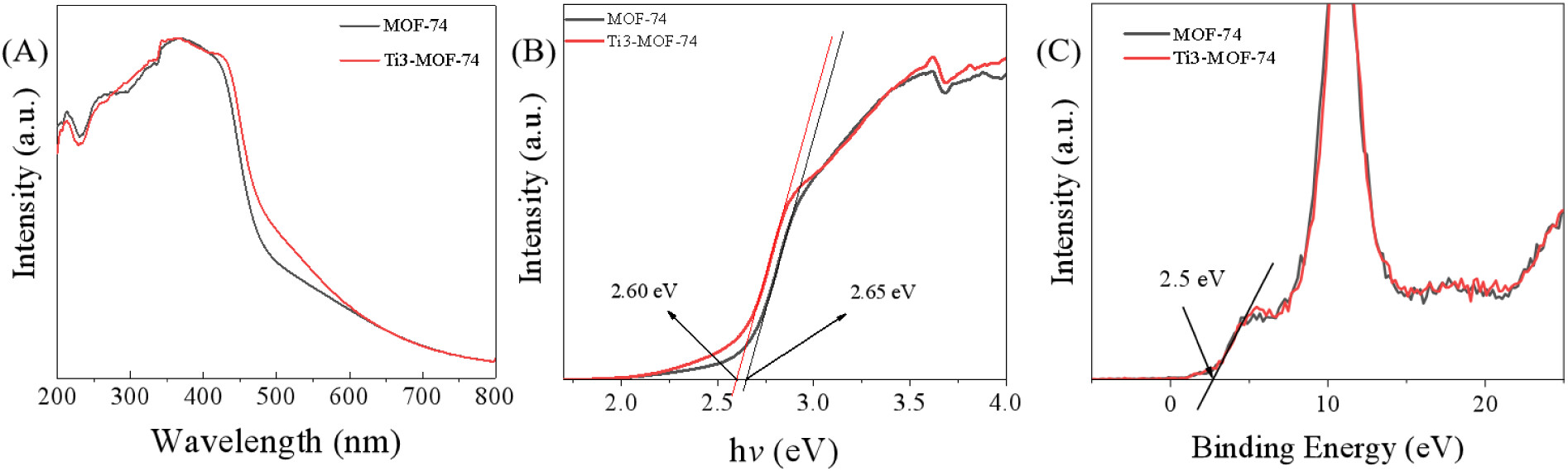 - 吸收光谱:原始MOF-74在200到500 nm范围内表现出强烈的吸收,Ti3-MOF-74在Ti4+离子掺入后吸收谱进一步增强。