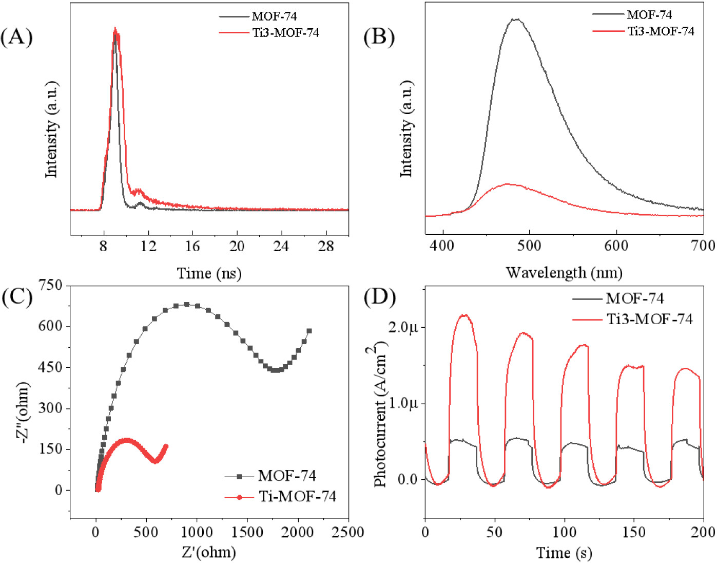 - TR-PL数据:Ti3-MOF-74引入Ti4+离子后,PL峰强度显著降低,光生电子的寿命从2.2 ns延长到7.4 ns。