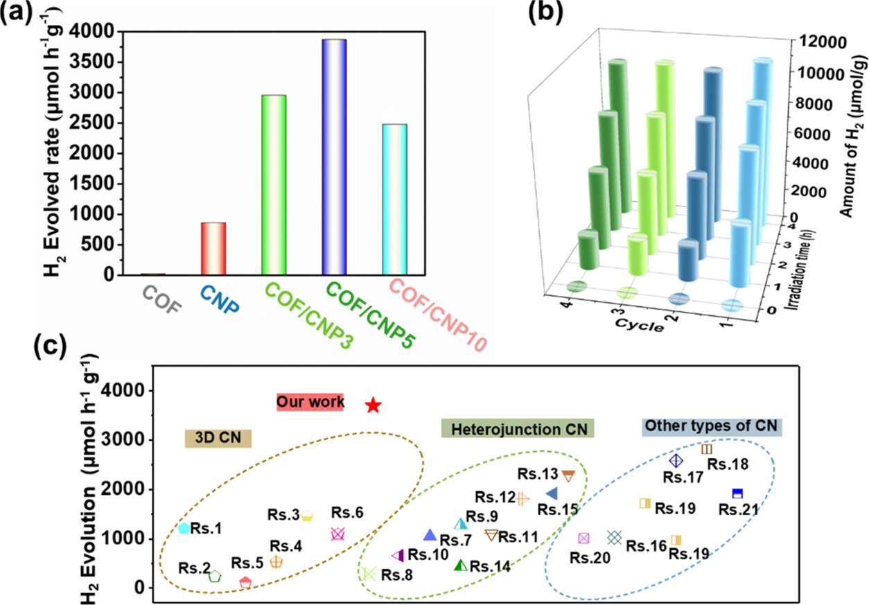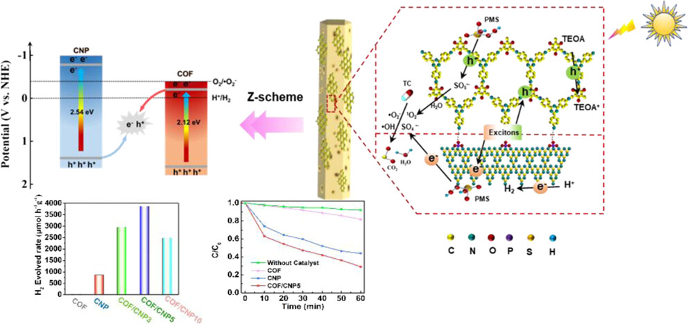 8. 光催化活性测试:COF/CNP5的光催化产氢速率达到3700 μmol h−1 g−1。在过氧单硫酸盐辅助下,COF/CNP5对四环素的降解速率常数是18.05 × 10−3 min−1。
