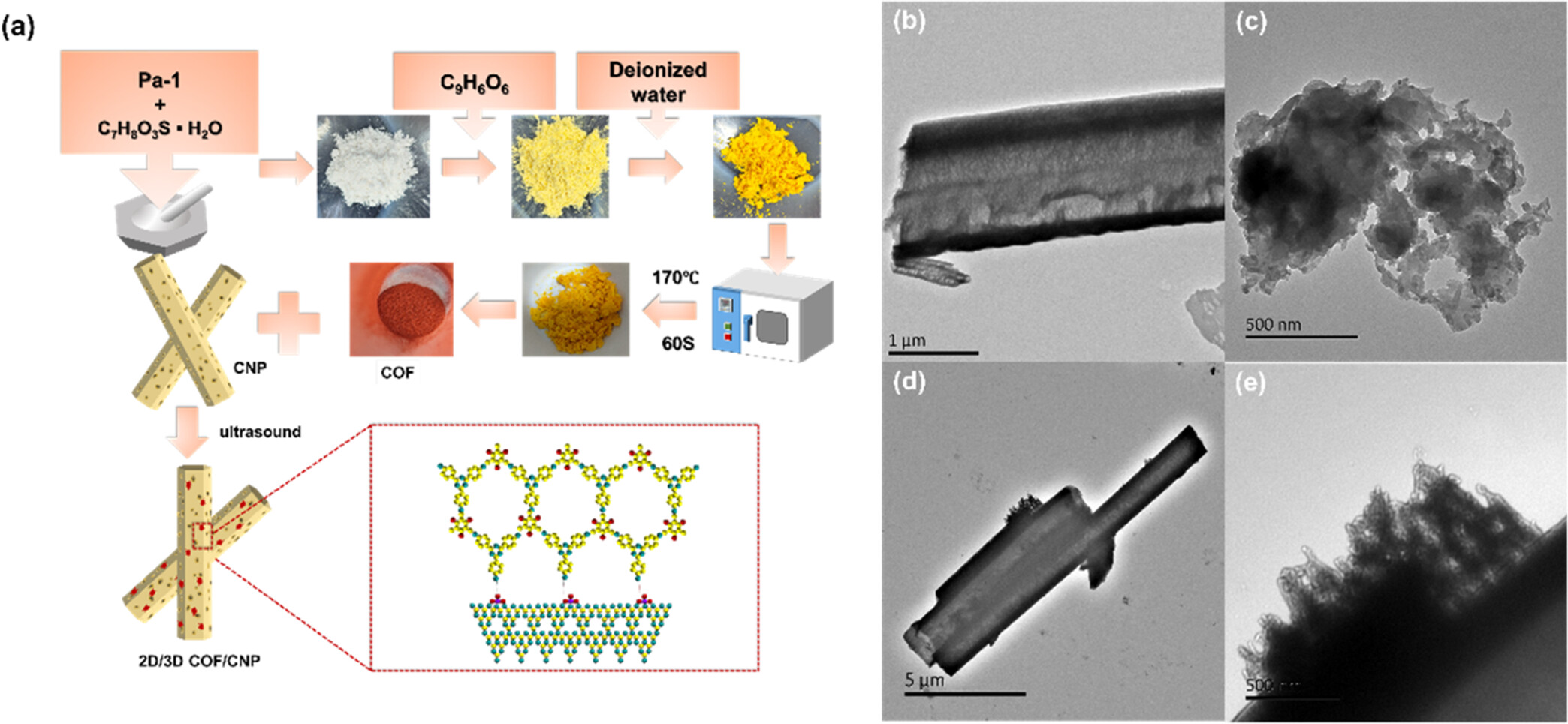 1) 南京林业大学邢伟男、吴光瑜老师等报道的本篇文章(ACS Appl. Nano Mater. 2024)中研究了一种新型的二维/三维(2D/3D)异质结复合光催化剂,该催化剂由二维共价有机框架(COF)纳米片和带有磷酸基团的三维多孔管状石墨碳氮化物(CNP)组成。