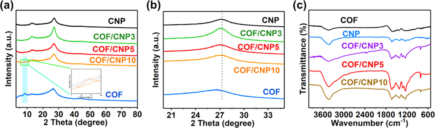 2. 傅里叶变换红外光谱(FTIR):CNP的特征吸收峰位于1200-1600 cm−1,COF的特征吸收峰位于1242, 1431, 和 3454 cm−1。