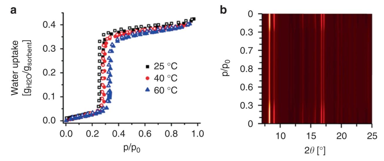 2) 研究者们发现了一种名为CAU-23的新型MOF,它在相对压力P/P0约0.3时具有0.37 gH2O/gsorbent的水吸附容量,且在至少5000个循环中显示出良好的循环稳定性。