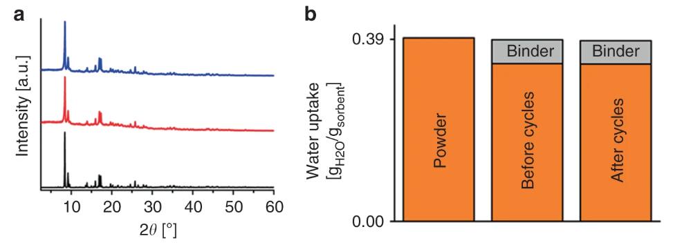 4) 稳定性测试:CAU-23在5000个水吸附/脱附循环后显示出良好的稳定性,通过PXRD和水吸附容量测量进行了验证。