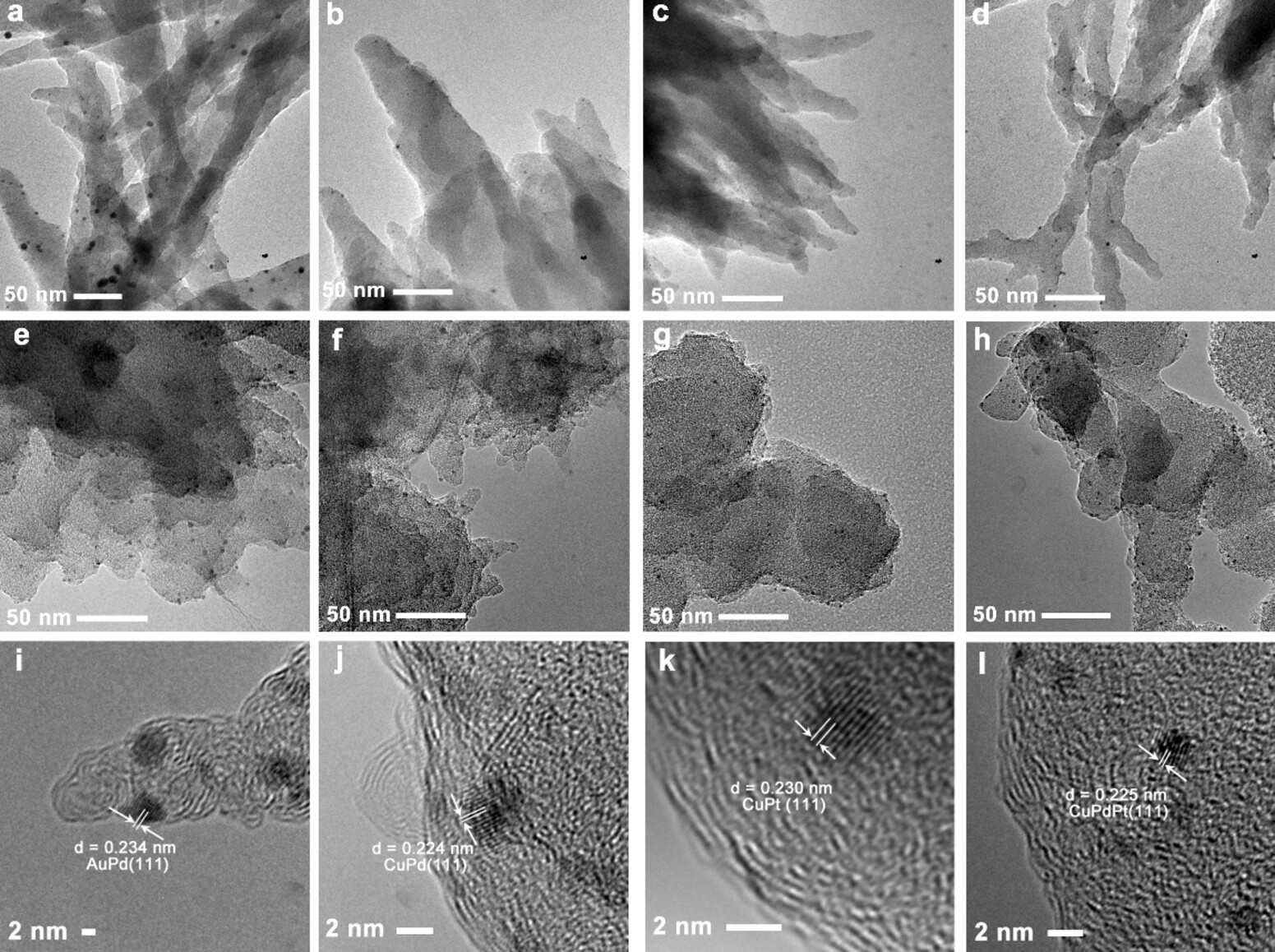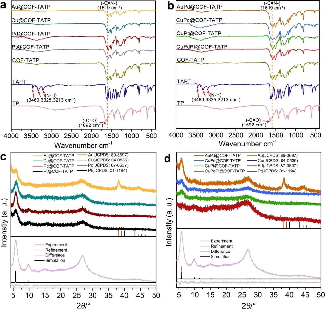 1) 将2,4,6-三(4-氨基苯基)-1,3,5-三嗪(TAPT)和三醛基间苯三酚(TP)以及不同的金属盐(如乙酸钯、硝酸铜、氯金酸和氯铂酸)分别溶解在二氧六环/甲苯(1:6 v/v)溶液中,混合后,将透明溶液置于含有0.5 mL冰乙酸(6 M)的10.0 mL饱和NaCl水溶液表面。