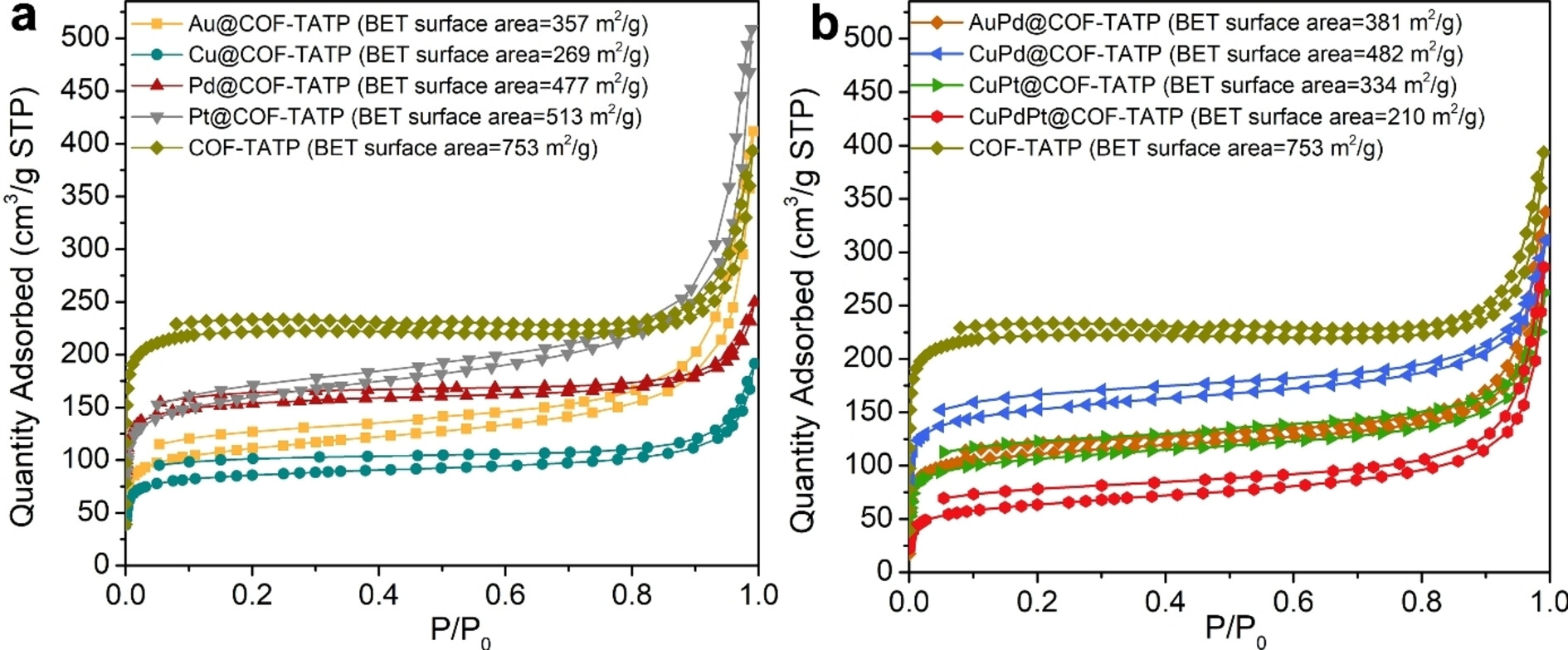使用布鲁纳尔-埃米特-泰勒(BET)方法对所得金属NPs载COFs的比表面积和孔隙结构进行分析,结果显示原始COF-TATP的比表面积为753 m²/g,金属NPs的引入导致COF通道的部分堵塞,比表面积减小。