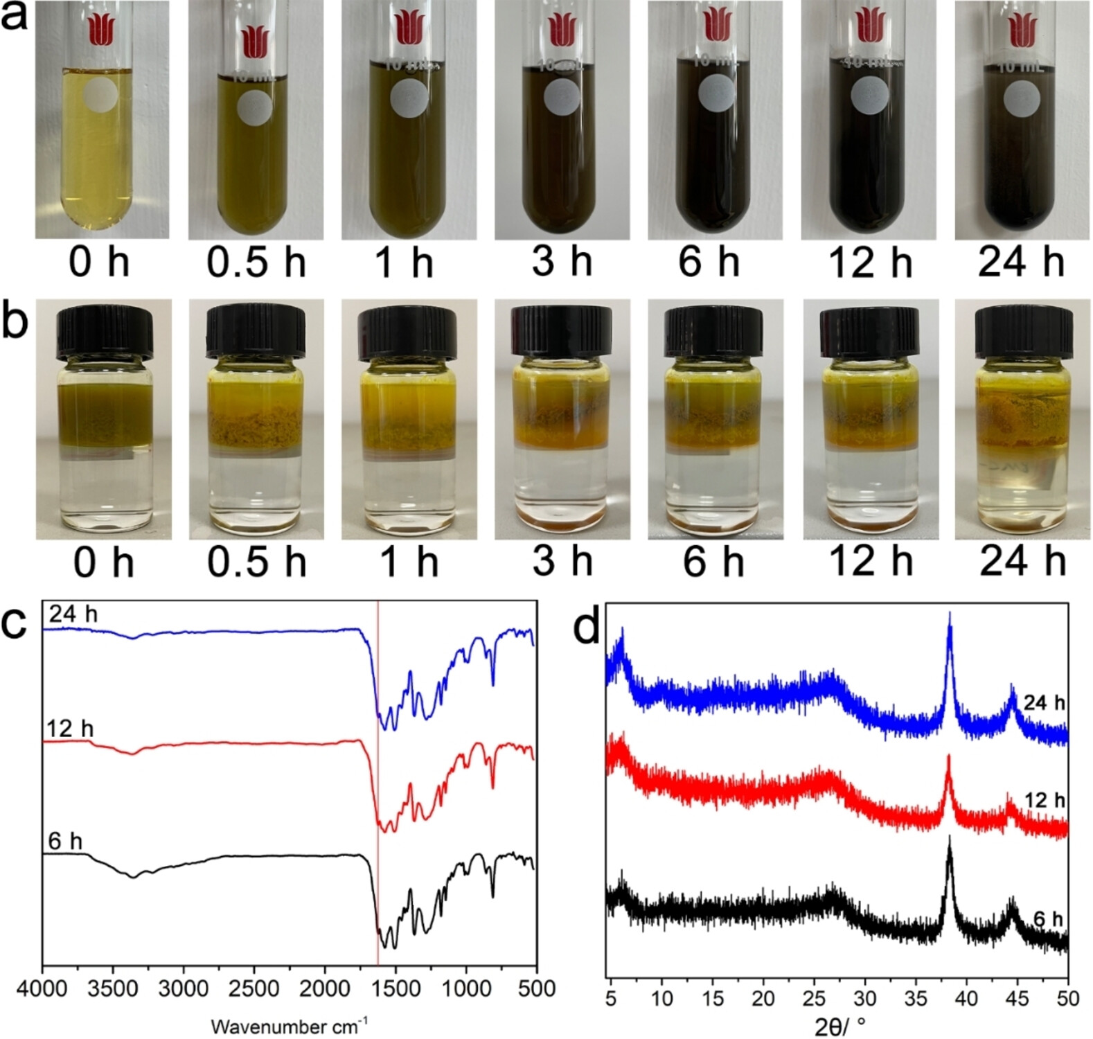 2) 在室温下,聚合反应在5分钟内开始,24小时后,界面处形成沉淀物,收集产物,用二氧六环洗涤,用乙醇中的NaBH4还原,再用乙醇和水依次洗涤,最终得到棕色粉末。