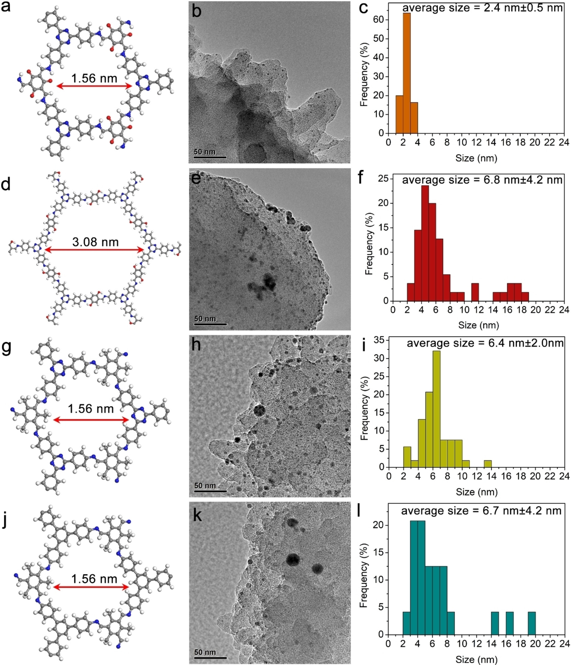 使用TEM和HR-TEM对金属NPs在COF基质中的分布和尺寸进行分析,结果显示金属NPs均匀分散在COF矩阵中,且尺寸较小,分布较窄。