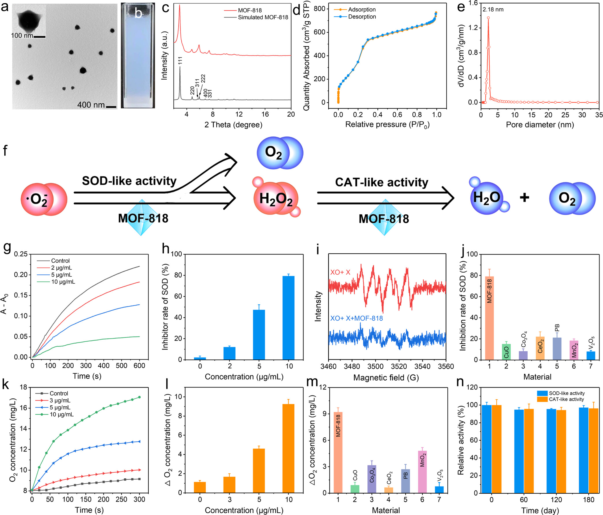 1) 使用NBT作为•O2–指示剂,通过X/XO系统生成•O2–,评估MOF-818的SOD样活性。