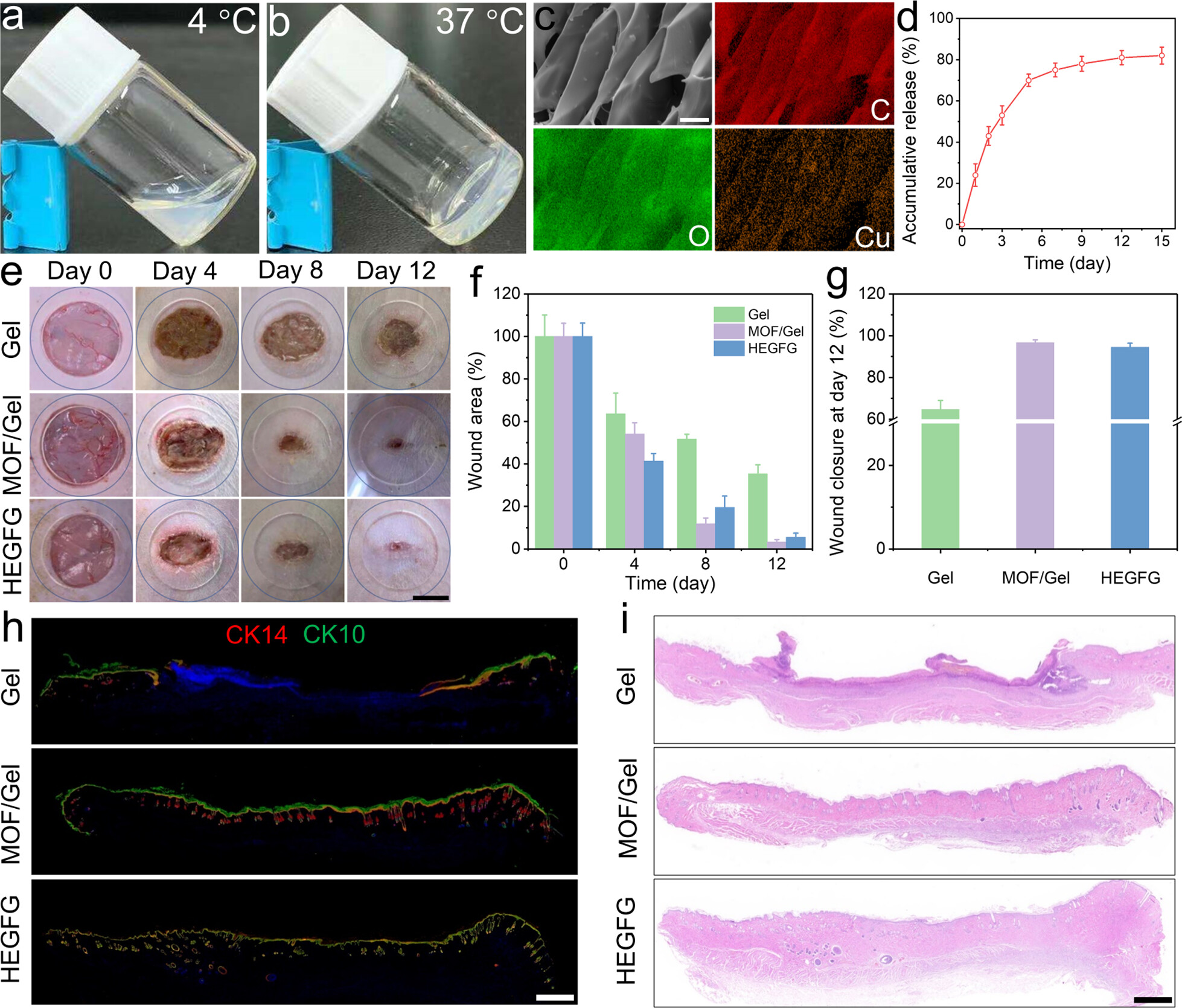 2) MOF-818纳米酶在水溶液中分散时,其催化活性可保持180天以上。与临床药物HEGFG相比,MOF/Gel系统在伤口闭合率上取得了类似的治疗效果,且在整个治疗期间只需一次性使用,证明了纳米酶的长期能力。